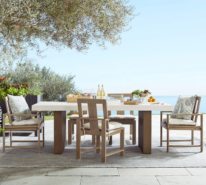 Inspired by the cool blues and hues of the ocean, this outdoor dining arrangement is perfect for those that are looking to spend more time outside, eating, relaxing, and enjoying the company of your guests.