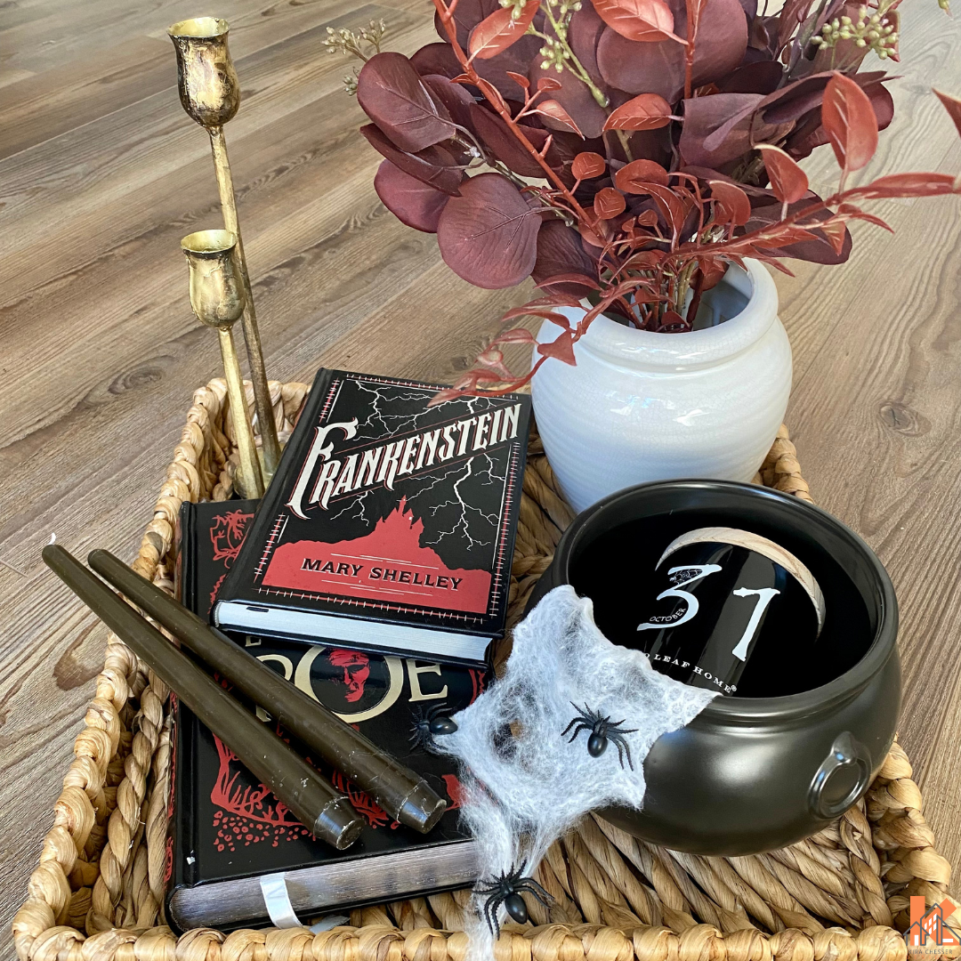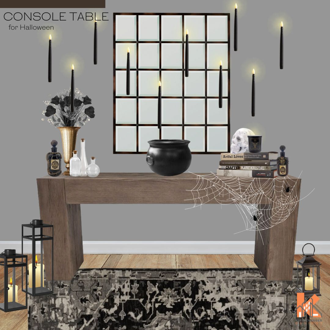 This console table setup is inspired by a more witchy Halloween theme.